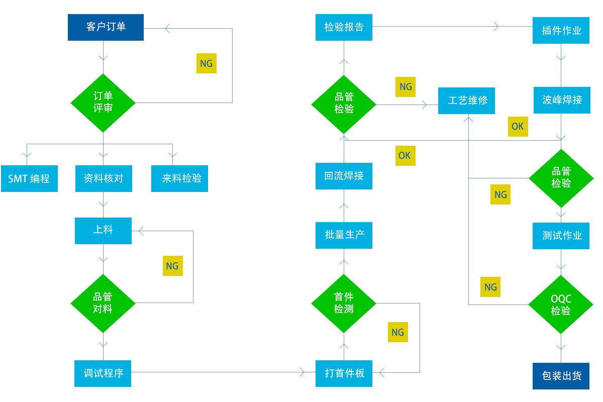 SMT貼片生產線4條,配備日本雅馬哈全自動貼片生產線、全自動錫膏印刷機、八溫區(qū)、十溫區(qū)回流爐、AOI、一體式貼片機等高端設備,芯片生產能力600萬焊接點/天,波峰焊加工日最大生產能力50萬點。具有安裝01005和0.40毫米間距BGA布局能力和電腦主板波峰焊接能力。